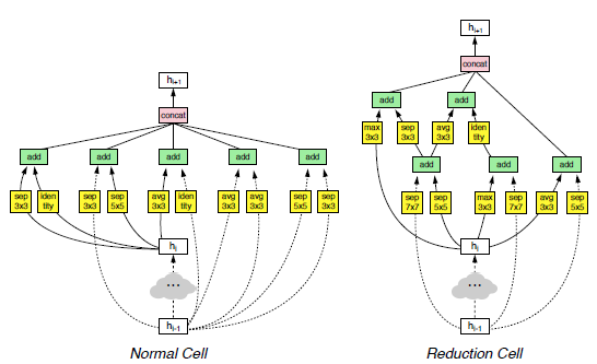 일반적인 CNN은 이미지의 입력 사이즈를 줄이는 down sampling을 갖고 있듯이 NASNet에도 어떠한 입력 사이즈에도 scalable한 architecture를 설계하기 위해 다음과 같은 2가지 cell 종류를 설계합니다.