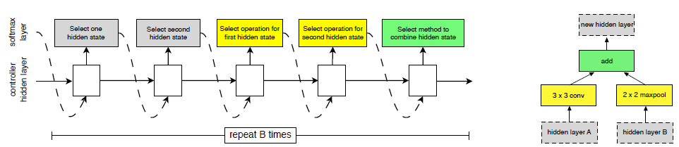 Block은 2개의 연산을 수행하여 하나의 feature map을 생성하는 역할을 하며 RNN controller의 block 예측 모델에는 5개의 block 구성 요소 예측이 들어 있습니다. 각 5개의 step마다 분류를 위한 독립적인 softmax layer가 들어가고 2개의 hidden state, 2개의 operation, 1개의 combine 방법을 선택하게 됩니다.
