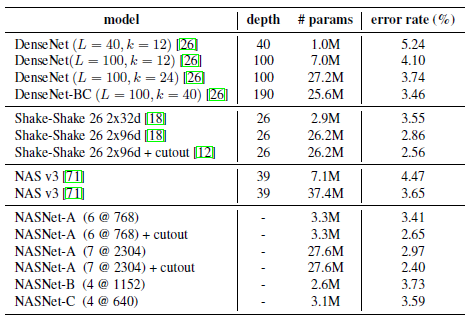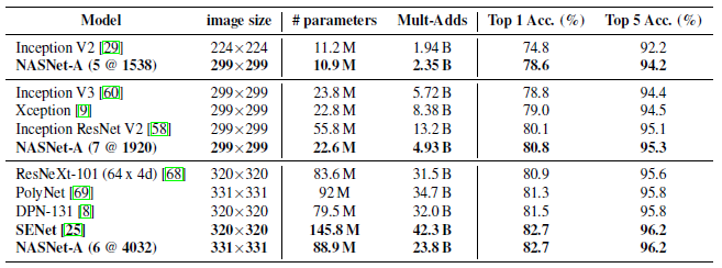 NASNet의 파라미터 수를 조절해가며 기존 방법론과 비교했을 때, 더 좋은 성능을 낸 것을 확인할 수 있습니다. 실험은 5번 실행해서 평균을 내었다고 합니다.