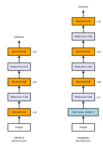 밑의 그림은 CIFAR-10과 ImageNet에 대한 network의 구성도입니다. ImageNet의 이미지 사이즈가 CIFAR에 비해 훨씬 크니 더 많은 Reduction cell이 있는 것을 볼 수 있습니다.