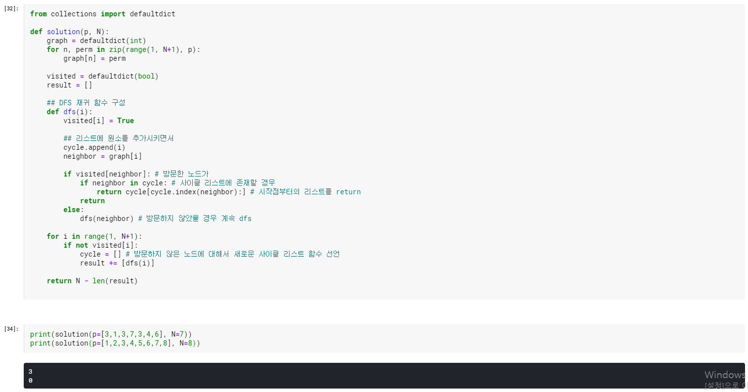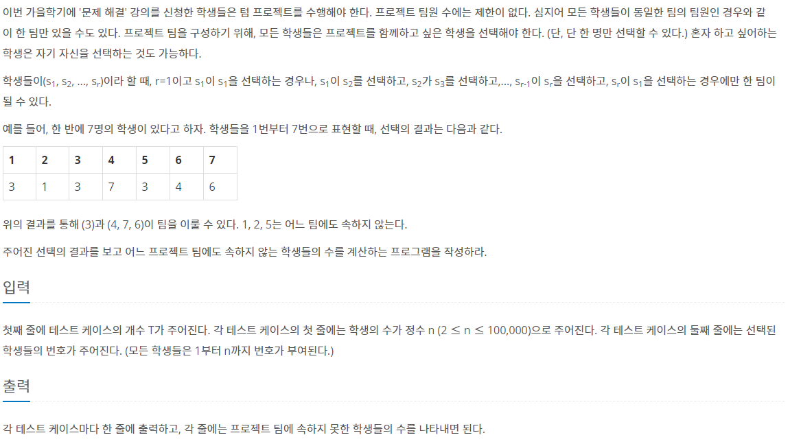 입력을 통해 그래프를 구성하고 사이클에 속하지 않은 정점들의 개수를 출력하는 문제입니다. DFS를 통해 노드를 재귀적으로 방문하면서 리스트를 채워주고 이미 방문한 정점에 도달했을 때, 그 시작점부터의 리스트를 반환하면 사이클에 속한 정점을 구할 수 있습니다. 이를 전체 노드 수에서 빼주면 답을 구할 수 있습니다.
