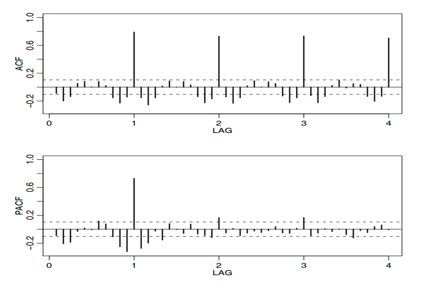 Seasonal MA(Q)는 MA$(Q)_S$로 표기되며 이는 수식으로 $X_t=a_t-\Theta_1 a_{t-s}-\Theta_2 a_{t-2s}-...$ 로 표현할 수 있습니다. Seasonal AR(P)는 AR$(P)_S$로 표기되며 $X_t=\Phi_1 X_{t-s}+\Phi_2 X_{t-2s} + ... \Phi_p X_{t-ps} + a_t$ 로 표현할 수 있습니다. Seasonal AR이 stationary 하기 위한 조건은 AR에서와 같습니다. 특히 AR$(1)_{12}$의 경우에는 $|\Phi|<1$ 이어야 stationary 조건을 만족하고 Yule-Walker equation은 $\rho_k=\Phi \rho_{k-12}$가 되어 $\rho_{12k}=\Phi^k$가 됩니다.