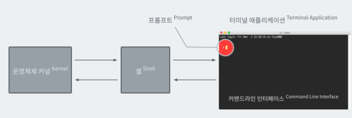 우리가 일반적으로 리눅스 커맨드 라인 (CLI)에 입력하는 명령어들은 모두 쉘 (Shell) 이라는 커널에 명령을 내릴 수 있는 interactive 프로그램에 의해 실행됩니다. 즉, 밑의 그림과 같이 CLI를 통해 사람이 알고 있는 명령 문자열을 입력하면 쉘은 이를 읽고 (Read) 이를 해석하여 명령어를 실행시키고 (Eval) 실행된 결과를 출력하면서 (Print) 이 과정을 반복합니다 Loop). 따라서 쉘은 REPL이라고도 합니다.