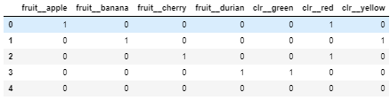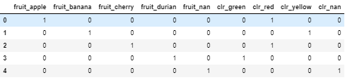 pd.get_dummies(fruit, prefix=['fruit', 'clr'], dummy_na=True)