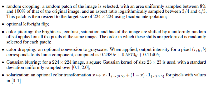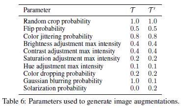 BYOL은 SimCLR과 같은 종류의 image augmentation인 1) 랜덤 cropping이후의 resize, 2) color distortion (brightness, contrast, saturation, hue, grayscale conversion), 3) Gaussian blur를 사용합니다. 전체 augmentation 종류는 밑과 같고 Figure 2의 augmentation $T,T'$은 아래 augmentation 순서대로 확률에 따른 조합으로 (Table 6) 이루어집니다.