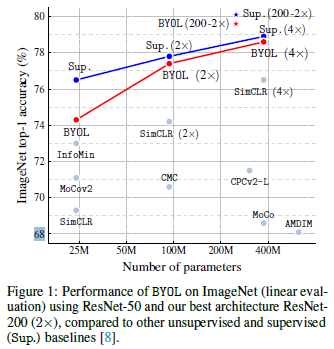 Figure 1의 성능을 보았을 때, 기존 self-supervised 방법론에 비해 더 우수한 성능을 보이고 파라미터가 많아질수록 지도학습 성능에 근접함을 볼 수 있습니다.