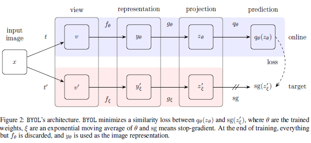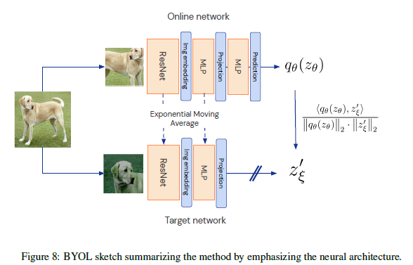 BYOL은 위 그림을 반복적으로 수행하며 A를 target networks, B를 target networks의 출력을 예측하는 online networks라 칭합니다. 즉, online networks를 target networks의 representation을 예측하도록 반복적으로 학습시켜 양질의 representations 뽑아내도록 합니다. 이러한 bootstrapping 과정을 반복적으로 수행하면서 target networks의 파라미터는 online networks의 파라미터와의 moving exponential average로 천천히 업데이트 시킵니다.