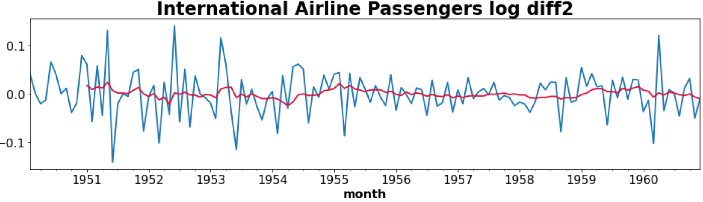 아직 stationary라 판단하기는 이르니, log transform을 한 이후에 2차 차분을 수행한 뒤에 ADF Test를 해보겠습니다.