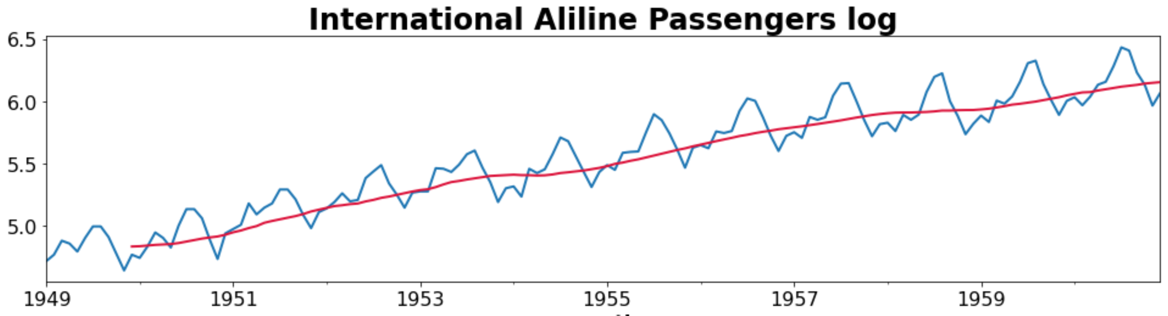 p-value가 매우 높고 test statistics도 매우 높게 나와 귀무가설을 기각할 수 없습니다. 즉, stationary 하지 않습니다. 더 나아가 분산을 줄이기 위해 log transformation을 취한 이후에 ADF Test를 적용해 보겠습니다.