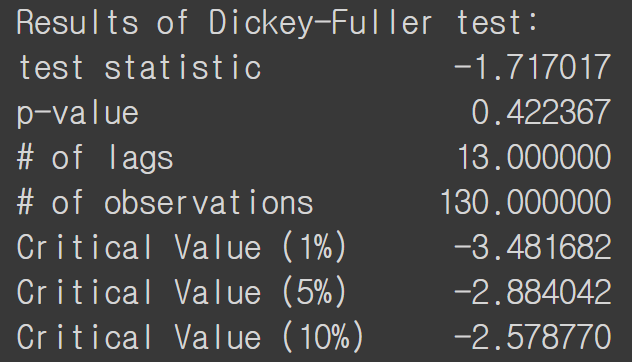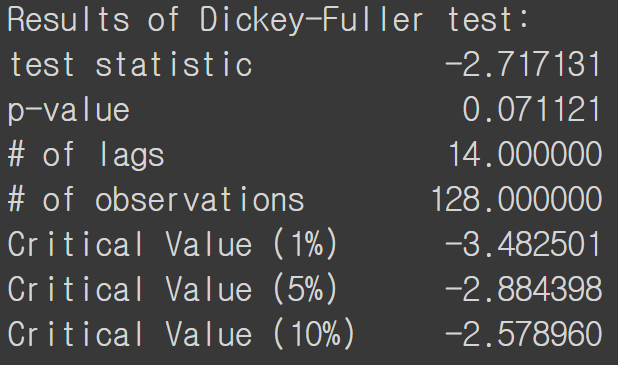 adfuller 함수안에 시계열 데이터를 넣을 경우 1) p-value, 2) test-statistics, 3) critical value, 4) lag, observation 개수를 결과로 얻을 수 있습니다. Critical value는 통계 검정에서 검정 값의 판단 기준으로 작용하는 값으로, 귀무 가설 상태에서 해당 확률 (1%, 5%)이 나오게 되는 값을 의미합니다. 즉, ADF Test의 검정 값이 critical value보다 낮게 되면 귀무 가설 상테에서 확률이 매우 낮은 상태이니 p-value가 낮아 귀무 가설을 기각할 수 있다는 말이 됩니다.