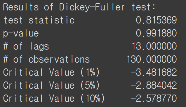위 시계열 데이터는 추세가 존재하면서 계절성을 가지고 있으므로 stationary하지 않다고 바로 알 수 있습니다. adfuller 함수를 이용해 ADF Test를 수행하면 다음과 같은 결과를 얻을 수 있습니다.
