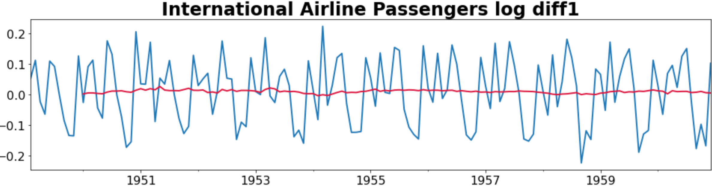 p-value가 낮아지긴 했지만 아직 매우 높고 test statistics도 critical value보다 높으므로 stationary 하지 않습니다. 그렇다면, log transformation을 하고 차분을 한 이후의 ADF Test를 진행해 보겠습니다.