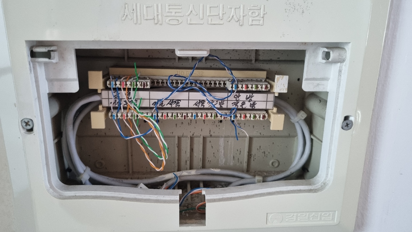 제주 집은 오래된 아파트라 최신 아파트처럼 큰 통신 단자함에 모뎀이 있는 게 아니라 전원 콘셉트가 없는 통신 단자함에 선이 연결되어 있는 구조였다. 아마 이천 년대 중반 이전의 아파트들은 비슷할 거다. 그나마 다행인 건 각 방마다 라벨링이 되어 있어 어느 방이 어느 단자로 연결돼 있는지 바로 알 수 있었다는 점이다.